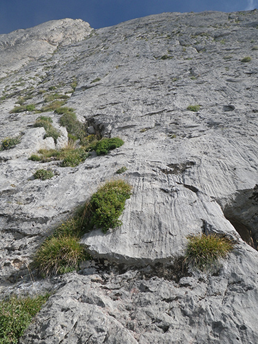 para después adentrarnos en el bosque, subir por una cuerda fija. Al cabo de unos 40 minutos de haber partido de la base de la tartera, debería hacer un rato que deberíamos estar viendo la cara sur del Pollegó Inferior. En cuanto podamos, nos pasamos a la base de ese lado de la pared para recorrerla paralela hasta llegar al pie de vía que empieza entre dos agujeros