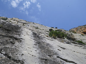 - L7 (V – 50m): Placa de con fisuras más bien horizontales, con los seguros distanciados y roca buenísima. La reunión cuesta de encontrar; tenemos que escalar con una ligera tendencia hacia la izquierda. La R está sobre unos matojos situados arriba y a la derecha de un reguero negro. Si no encontramos la R habrá opción de realizarla en un árbol.