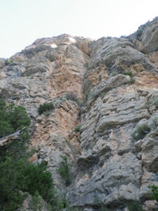 - L11 (V+ – 50m): Salimos escalando por el lado derecho el muro que nos queda delante para esquivar unos pequeños techos que vemos desde la R. Una vez estemos por encima de los techillos ir por la placa hacia la izquierda y en cuanto podamos, ascender para buscar la reunión en un árbol. Desde ese árbol habrá que caminar hacia la derecha para ir a buscar el último largo de la vía. Éste último largo empieza algo a la izquierda de un árbol con una cuerda para montar R (está roñoso y cuesta de ver). Hay opción de realizar un escape hacia la izquierda.