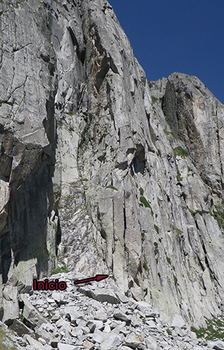 Pasaremos junto a dos lagos, el primero Estany de Tumeneia de Baix y el segundo Estany de Tumeneia de Dalt. Cuando estemos al inicio del segundo ya deberíamos de ser capaces de identificar la pared. Vamos siguiendo los hitos, que nos dirigirán por un camino factible bordeando el lago. Cuando nos acerquemos a la pared se verá más claramente la fisura de inicio de vía.