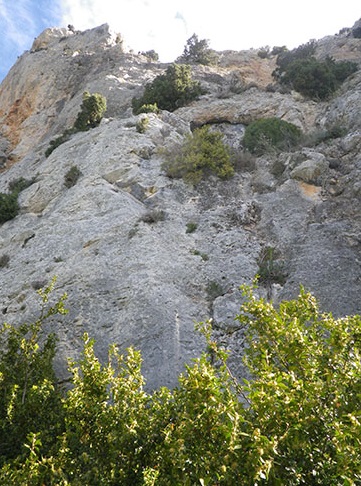 pared; hemos de seguir unos 80 metros más adelante junto a un risco y un hito en el suelo donde comienza un sendero que se dirige hacia la pared. En general está bastante pisado, al final habrá algún desvío e iremos hacia la pared tomando como referencia el espolón de la pared. Los primeros parabolts se ven claramente desde el suelo.