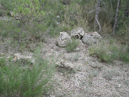 matorrales. Lo reseguimos y al cabo de unos 3 minutos nos encontramos unos grandes bloques de piedra esparcidos por el suelo a nuestra izquierda (ver foto). Meterse por ahí que en unos 20 metros iremos a parar a un GR marcado con líneas azul cielo y amarillo. Ahí tirar hacia la izquierda, dirección pared. Unos 5 minutos más tarde nos encontraremos un desvío marcado con dos hitos a nuestra izquierda y uno a nuestra derecha en un matorral. Este desvío nos