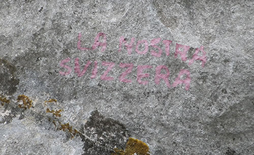 Al inicio es un camino bastante cerrado por la vegetación, más adelante habrá que cruzar una tartera con ayuda de unos hitos. Ya junto a la pared habrá nombres escritos a pie de vía. Lo más seguro es que veamos antes el de La mia Sardegna que empieza algo a la derecha de la vía La Nostra Svizzera. Hay un árbol entre las dos vías. La nuestra tiene el nombre de vía escrito en rosa.